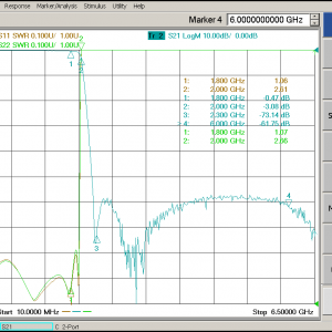 该大洋低通滤波器(OLP)的产品名称是OLP-2000-A,其截止频率为2.0GHz,通带频率为:DC-1.8GHz,通带VSWR为≤1.4:1。其阻带频率为:2.3-6.0GHz,阻带衰减为:≥45dB.